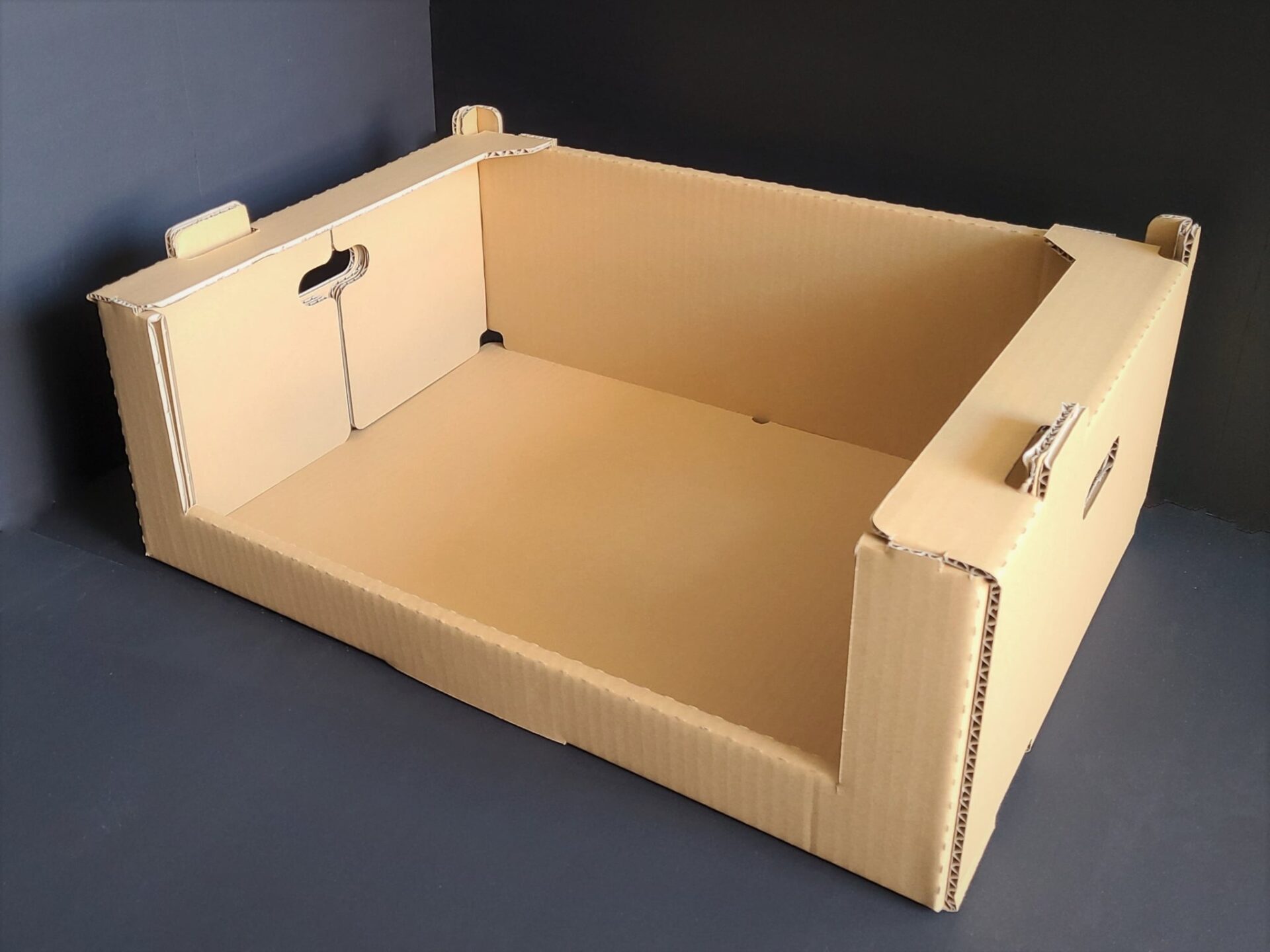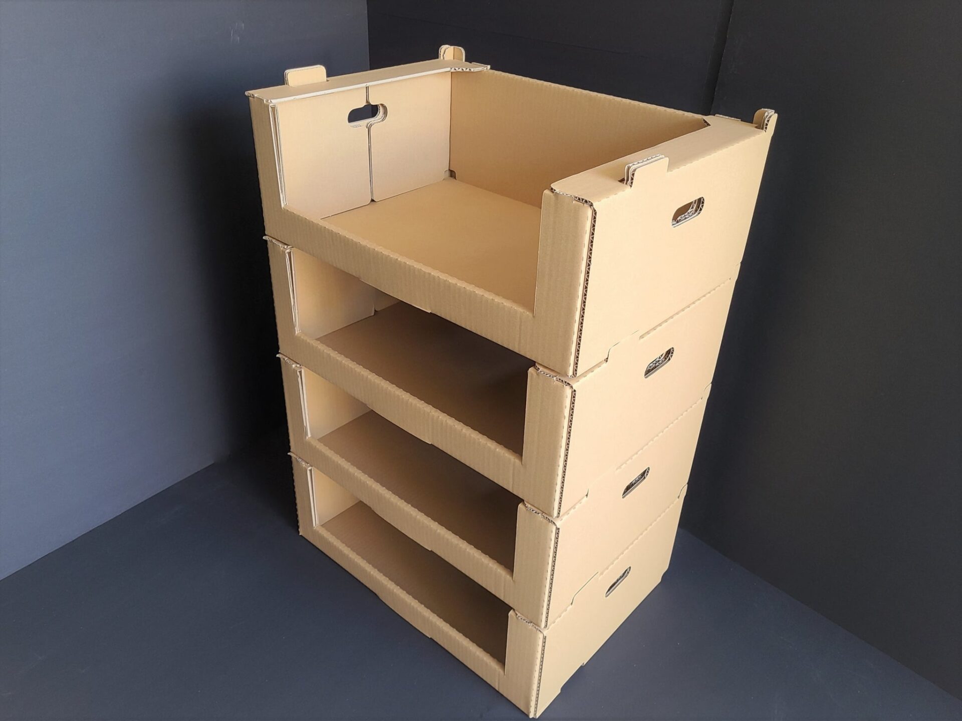 こちらは組み立て式の収納棚で、ヒラ状態の段ボールを折って組み立てます。糊やテープなどは必要ありません。